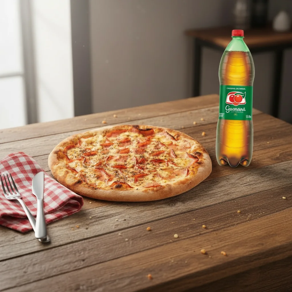 Pizza gigante 12 fatias, até 4 sabores tradicionais, com borda + pizza doce 4 fatias + Refrigerante.