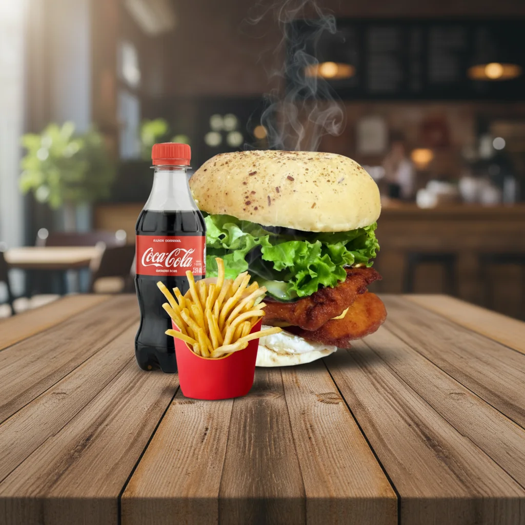 Pão, Frango Empanado, Mussarela, Cream Cheese, Alface e Picles. 100% produção própria, 250g de frango empanado.