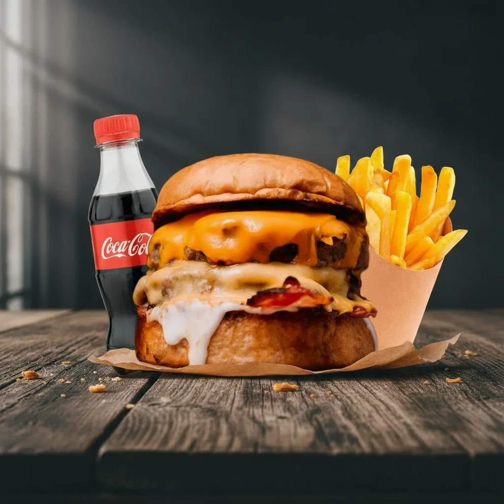 Pão, hambúrguer (assado), queijo cheddar, tomate, alface e barbecue. Produção própria, hambúrguer 200g com 100% carne.