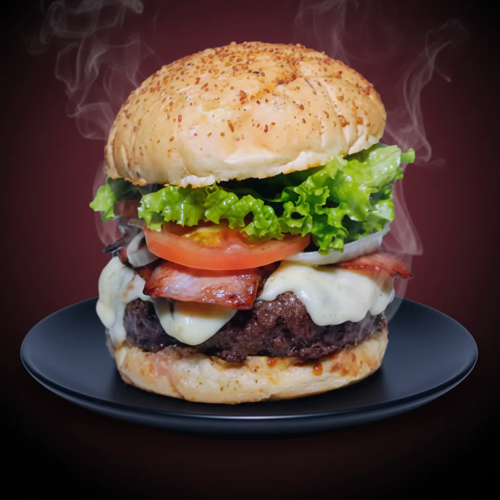 Pão, hambúrguer (assado), Bacon, Mussarela, Barbecue, Cebola, Alface e Rúcula.