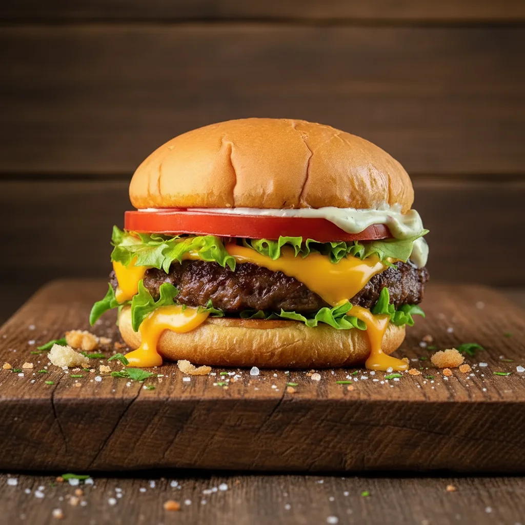 Pão, hambúrguer (assado), queijo cheddar, tomate, alface e barbecue.