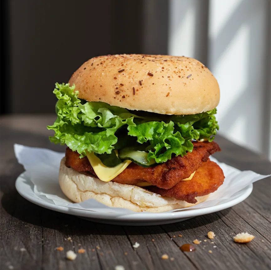 Pão, Frango Empanado, Mussarela, Cream Cheese, Alface e Picles.
