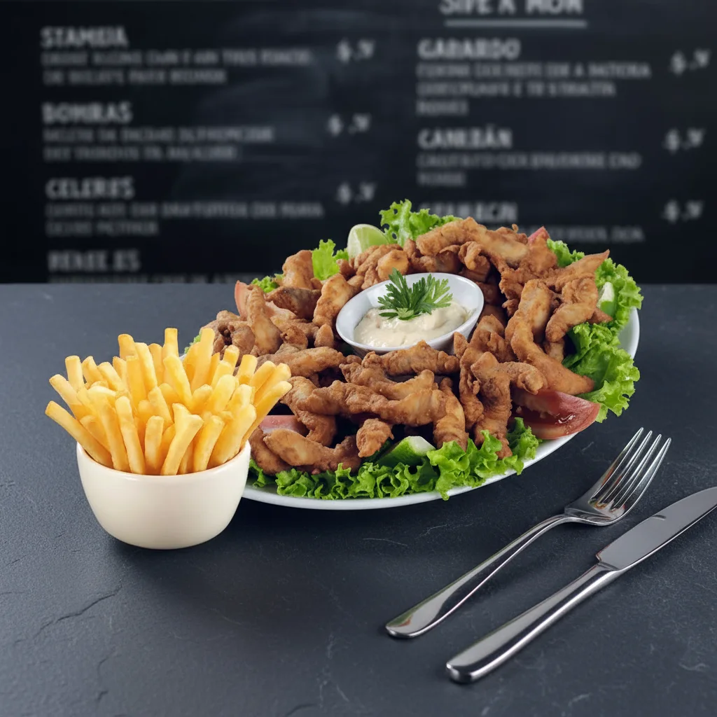 Camarão e isca de peixe misturados. Acompanha: fritas e molho rose. *indicado para 2 pessoas.