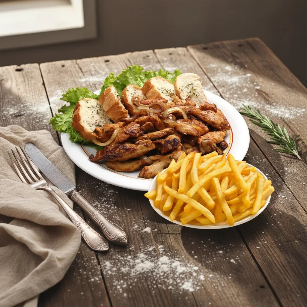 Com: tomate e cebola.acompanha: pão, batata frita e farofa.
